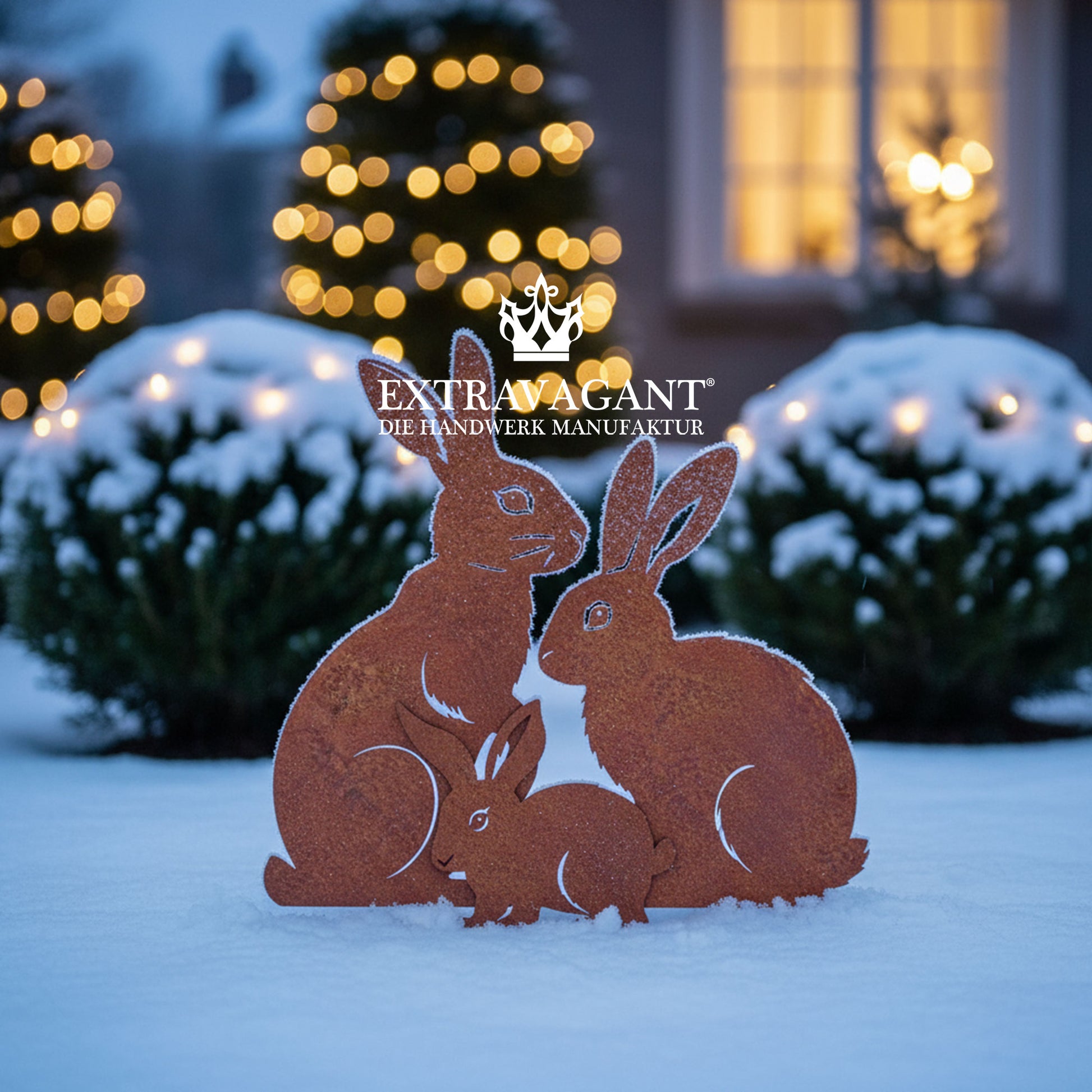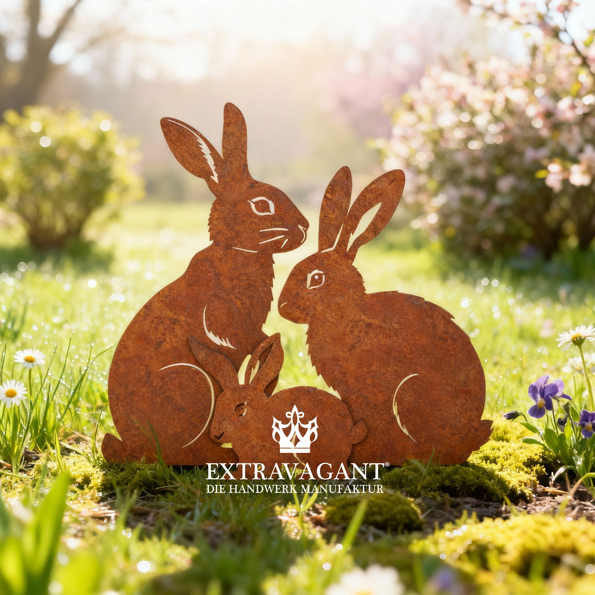 Die drei Figuren – Papa Hase, Mama Hase und Baby Hase – sind detailreich gearbeitet und ergeben zusammen ein harmonisches Ensemble, das besonders im Frühling oder rund um Ostern seinen ganzen Zauber entfaltet.