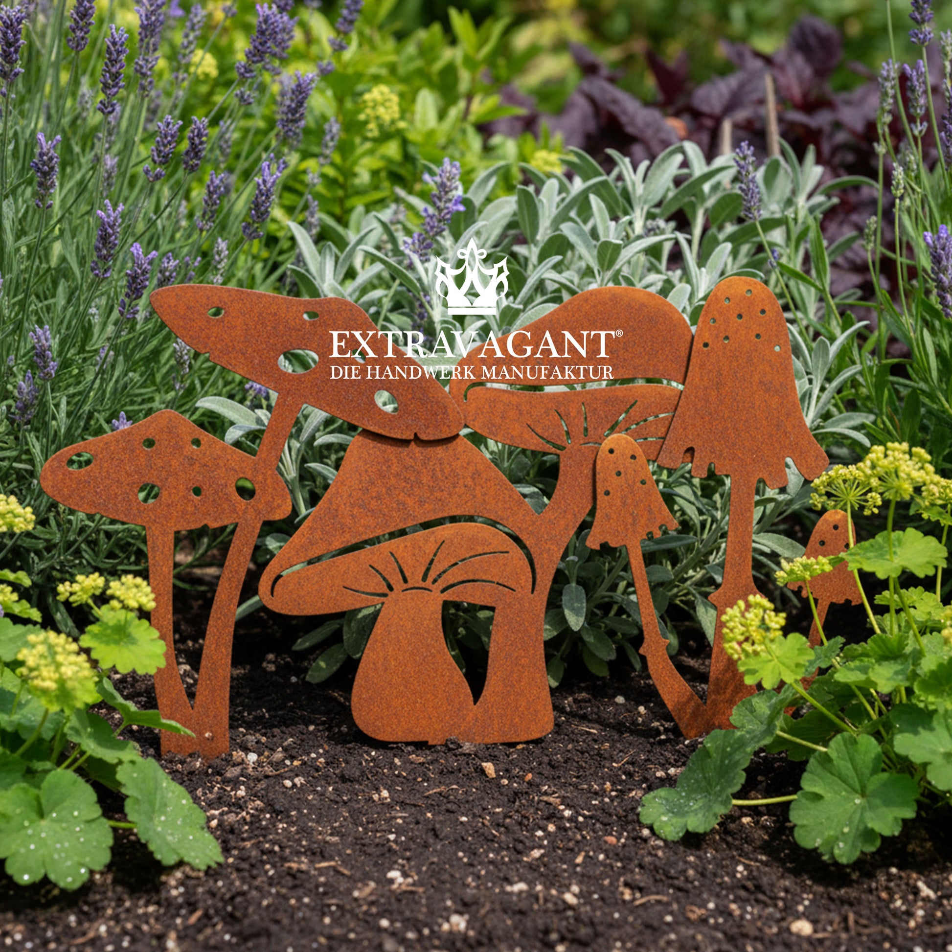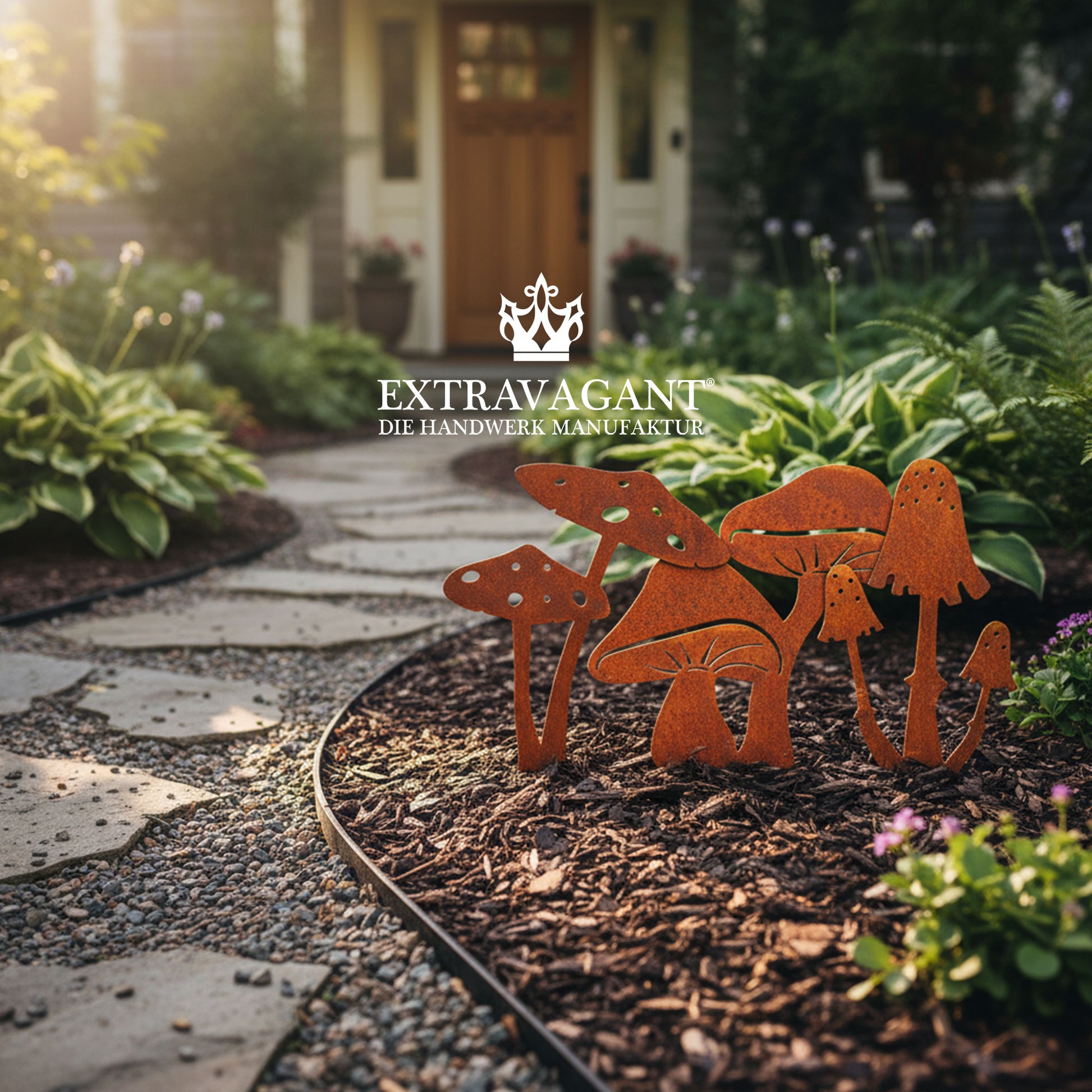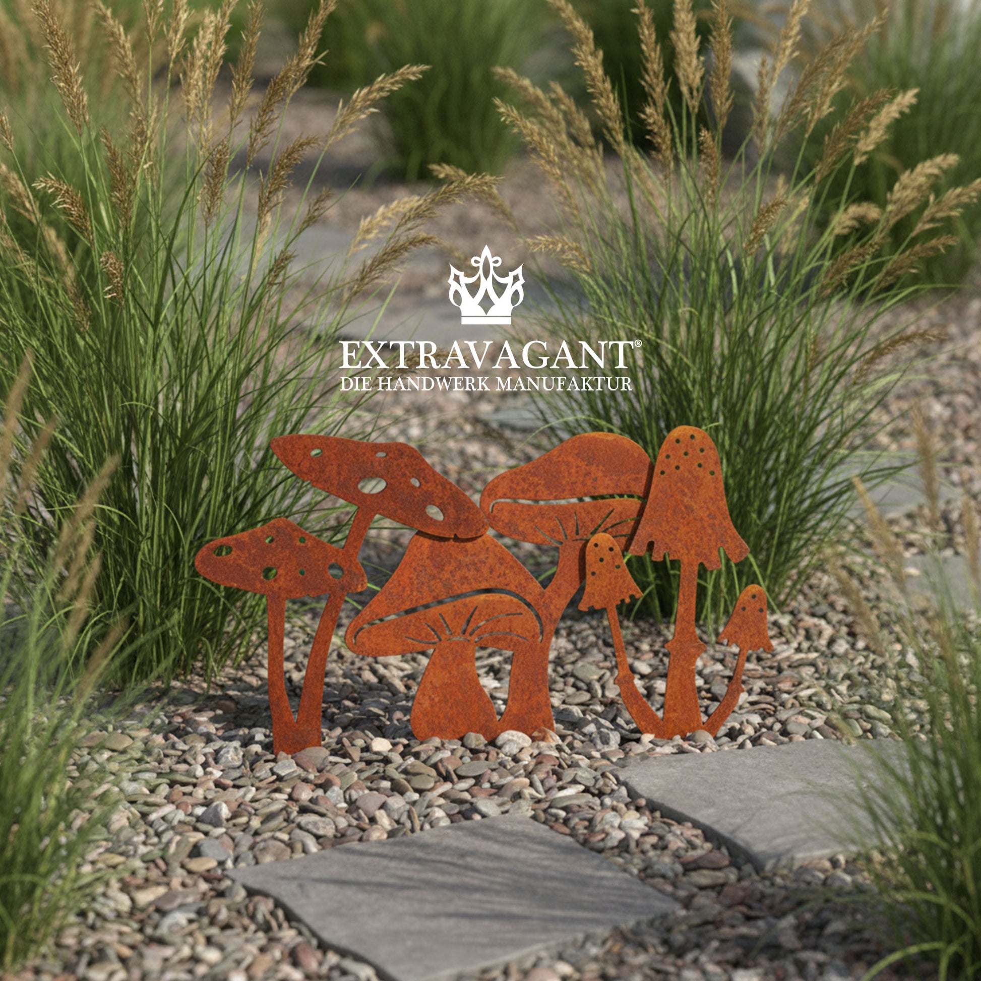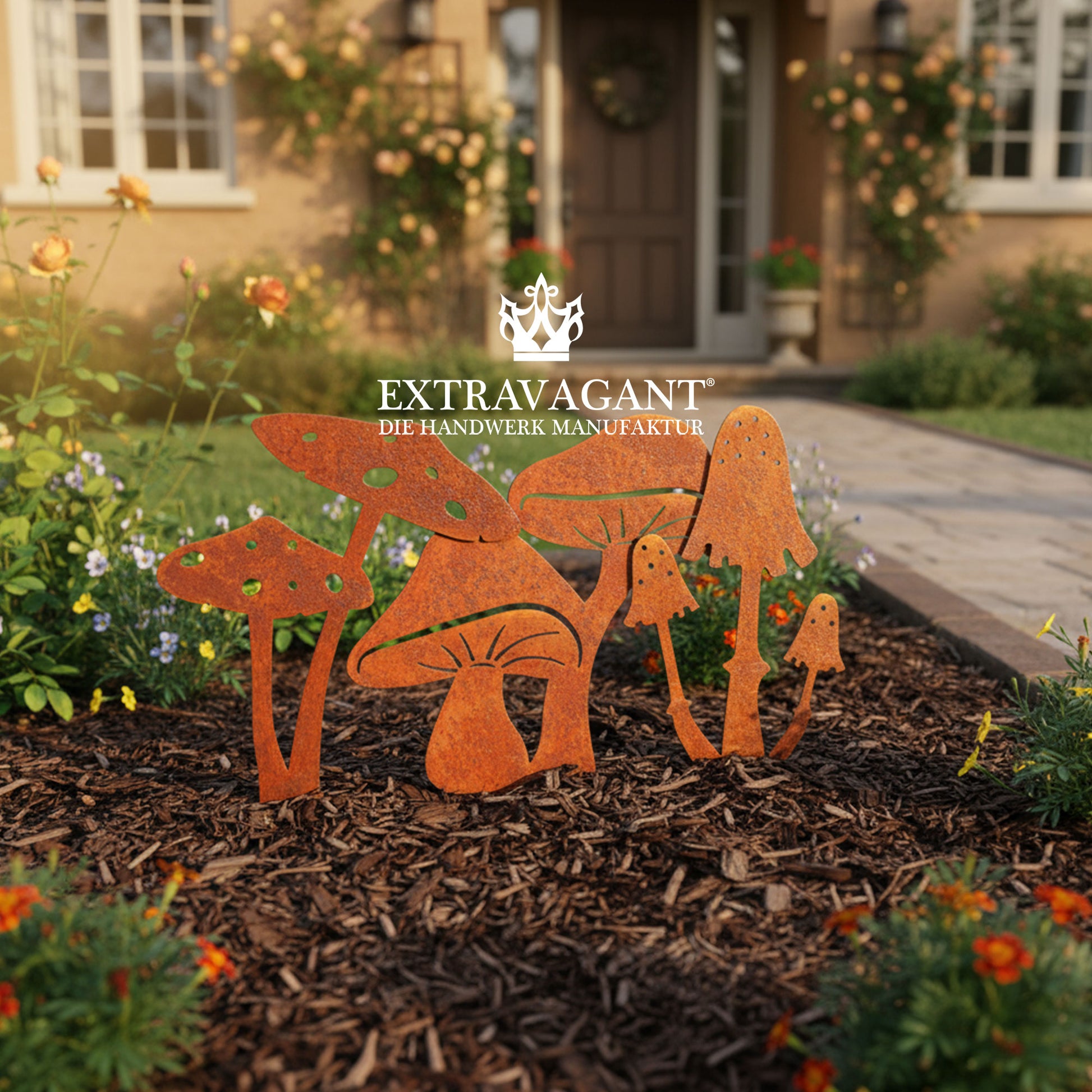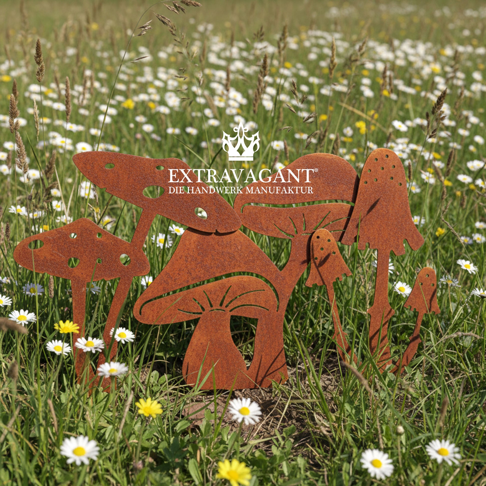Jeder Pilz wird aus robustem Metall gefertigt und erhält mit der Zeit eine individuelle Edelrost-Patina, die ihn unverwechselbar macht. Ob einzeln gesetzt oder als Gruppe arrangiert – die Kombination wirkt lebendig und stilvoll zugleich.