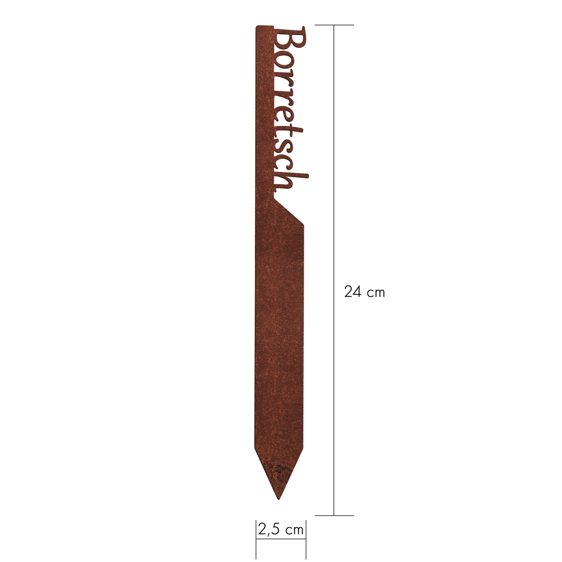 Gefertigt aus 1 mm starkem Metall, entwickelt der Stecker im Außenbereich seine charakteristische Edelrost-Patina. So entsteht eine Oberfläche, die perfekt mit naturnahen Gärten, Wildblumenbeeten oder Kräuterschnecken harmoniert.