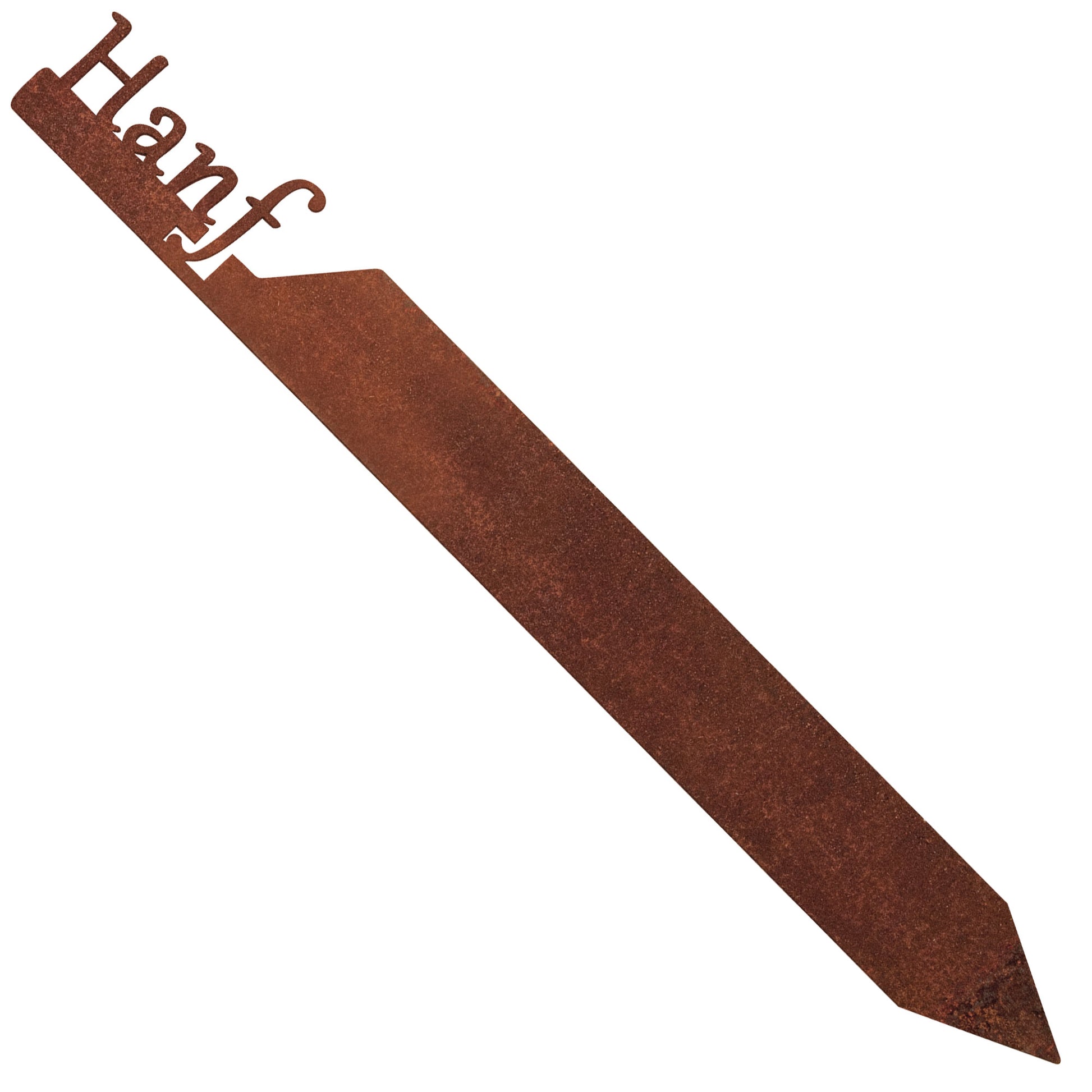 Mit dem Gartenstecker „Hanf“ aus Edelrost erhält diese besondere Pflanze eine klare, stilvolle Kennzeichnung. Der reduzierte Schriftzug wirkt modern und selbstbewusst, ein bewusst gesetztes Detail zwischen markanten Blättern und kräftigem Grün.